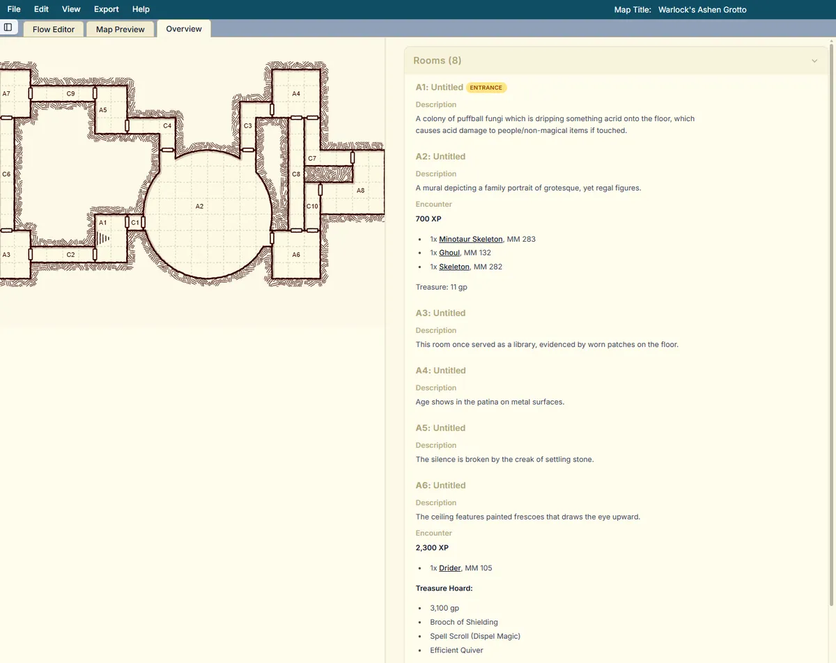 Encounters, traps, treasure, descriptions. Done. Dungeon Flow auto‑populates the whole dungeon so you’re not copying stat blocks at midnight. Change any detail with one click.